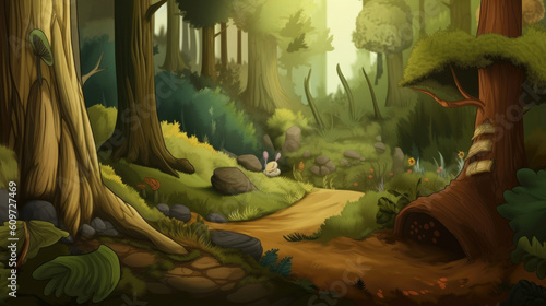 Forest woodland with trees as nature cartoon background (Generative AI)