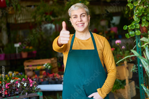 Stolze Floristin mit Daumen nach oben im Blumenladen