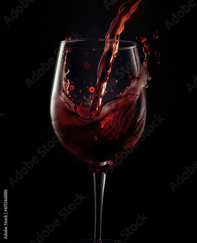 Red wine pouring in glass on black background (Generative AI)