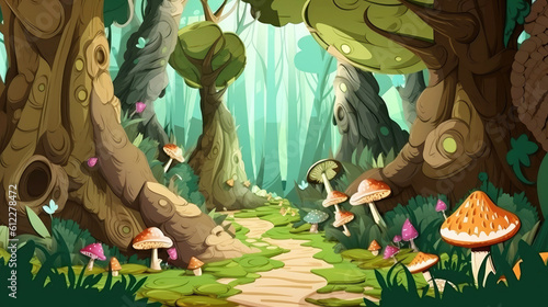 Hiking trail through magical cartoon forest woodland (Generative AI)