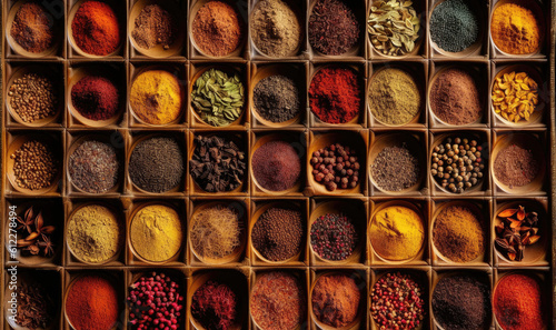 Top view of variety of different colorful spices as wallpaper (Generative AI)