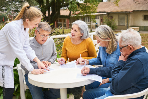 Doctor with elderly friends solving crossword puzzle and maze in garden