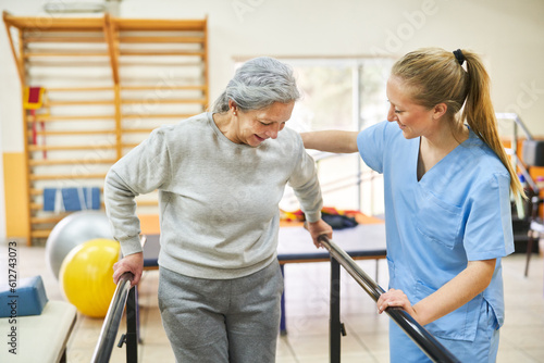 Physiotherapist assisting elderly woman in movement therapy at rehab center