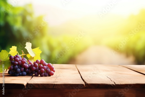 Wooden table with red grapes in a vineyard (Generative AI)