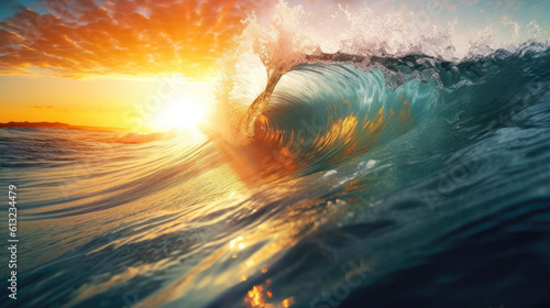 Ocean water splashing as wave with sunset in the evening (Generative AI)