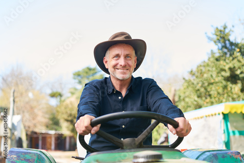 Happy farmer driving tractor on farm