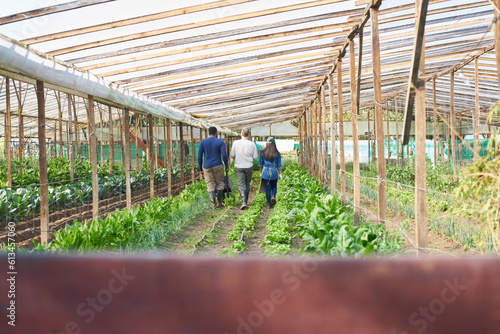 Male and female multiracial farmers discussing over tablet PC at greenhouse