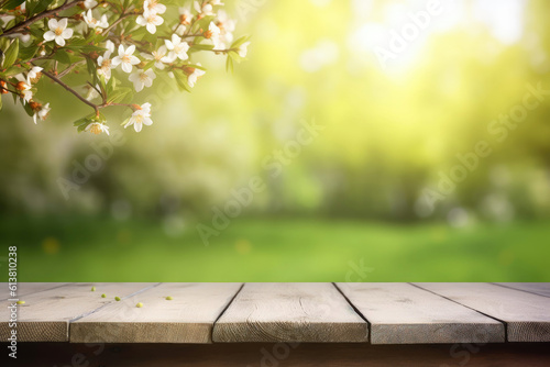 Empty wooden table in spring garden with cherry tree (Generative AI)