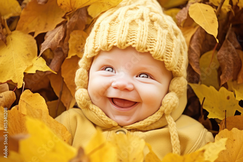 Cute smiling happy baby in autumn leaves (Generative AI)