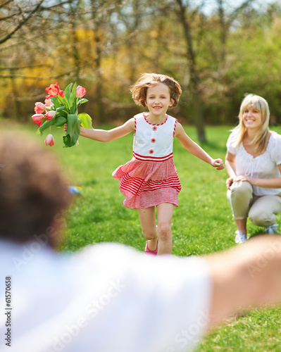 Kind im Garten läuft zum Vater