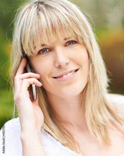 Blonde Frau telefoniert lachend mit ihrem Mobiltelefon