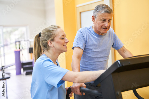 Physiotherapist assisting elderly woman in movement therapy at rehab center