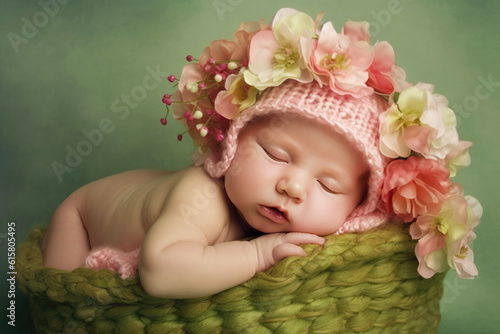 Cute happy baby with easter bunny hat in spring flowers (Generative AI)