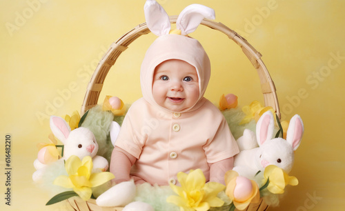 Cute happy baby with easter bunny hat in spring flowers (Generative AI)