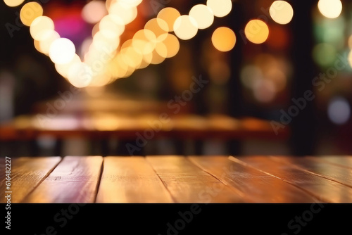 Empty wooden table in dark restaurant with glowing lights (Generative AI)
