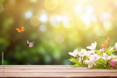 Empty wooden table with spring flowers and butterflies (Generative AI)