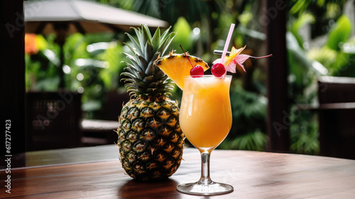 A refreshing fruit smoothie or cocktail garnished with pineapple