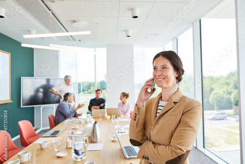 Smiling businesswoman talking on smart phone with colleagues discussing in conference room at office