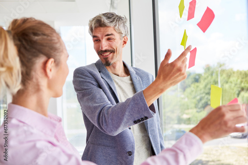 Cheerful businessman discussing over sticky notes on window with businesswoman during meeting in office