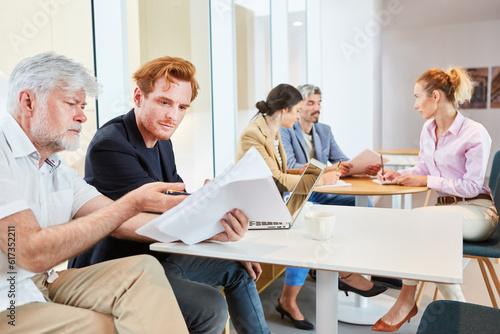 Senior businessman discussing over documents with male colleague sitting at table in office lounge
