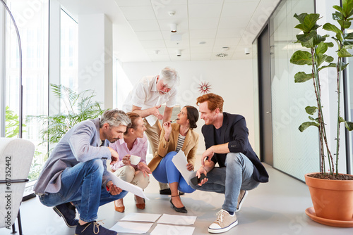 Senior businessman brainstorming with colleagues while discussing over documents on floor in office lounge