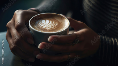 Close-up of a fresh aromatic cup of coffee with intricate latte art