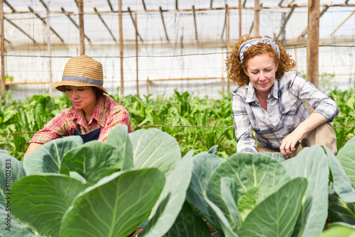 Multicultural farmers harvesting fresh organic vegetables in farm