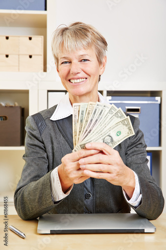 Seniorin im Büro mit Sparschwein und Geldscheinen