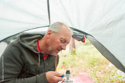 Senior man in tent drinking cup of hot coffee from thermos jug