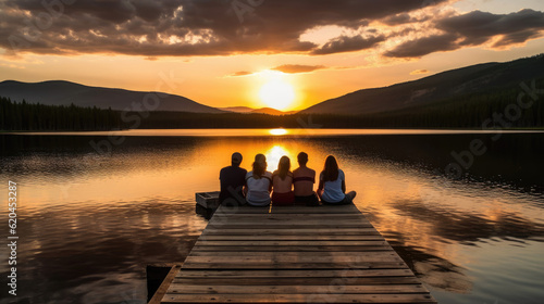 Group of friends sitting on dock in the evening watching sunset