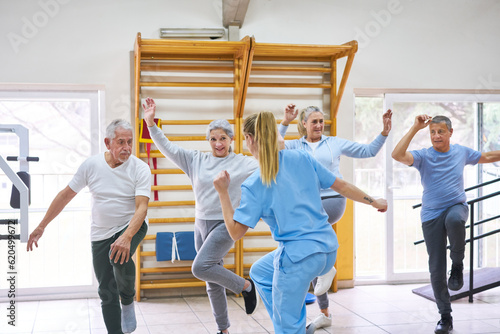 Physiotherapist assisting elderly woman in movement therapy at rehab center