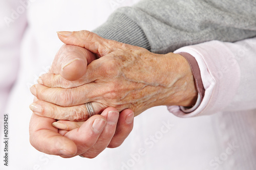 Hands of a senior woman hold for comfort and concern