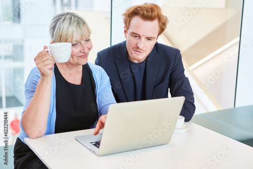 Smiling mature businesswoman holding coffee cup looking at laptop with businessman in office lounge