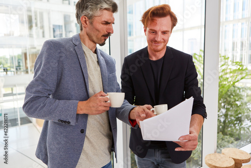Male colleagues with coffee cups discussing over documents while standing against window at office