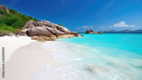 Tropical paradise beach with crystal clear water and white sands under a blue sky