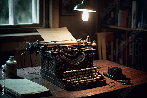 Old dusty typewriter on desk in dark attic