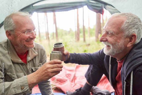 Senior men toasting insulated drink containers in tent