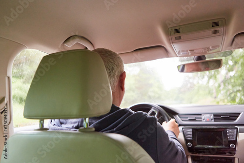 Senior man traveling in car during road trip