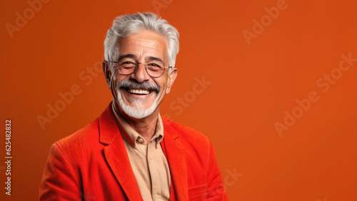 Elegant senior man with a striking head of white hair poses in a stylish orange sweater