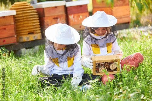 Smiling girls with wooden insect hotel on grass