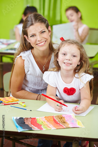Erzieherin mit Mädchen beim Malen im Kindergarten