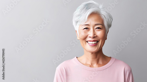 Elegant portrait of a glowing Asian woman in her 60s with short silver hair and a gentle smile
