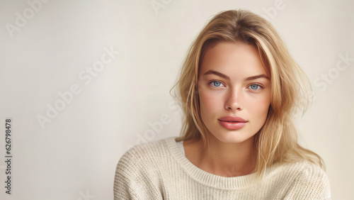 Caucasian woman in 20s, blonde hair, cream color theme