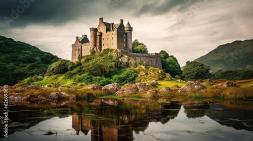 Majestic medieval castle in a serene mountain landscape at sunrise