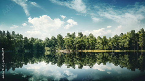 Serene lake reflecting surrounding foliage and summer sky