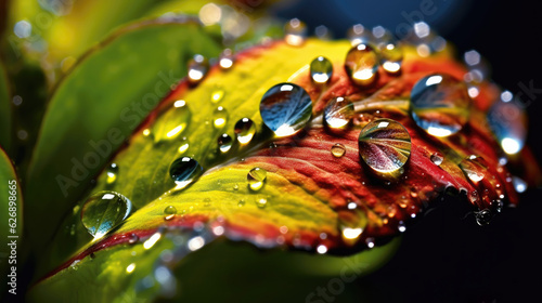 Macro shot of dewdrops on a colorful leaf, showing nature's beauty
