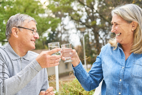 Cheerful elderly friends toasting glass of water in garden