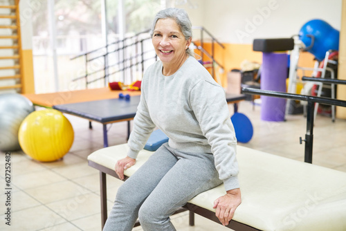Elderly woman sitting on exercise table at rehab center