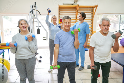 Physiotherapist assisting elderly woman in movement therapy at rehab center