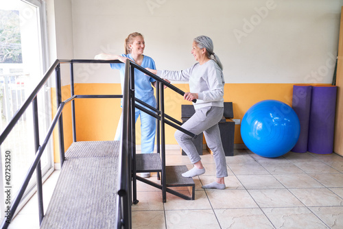 Physiotherapist assisting elderly woman in movement therapy at rehab center